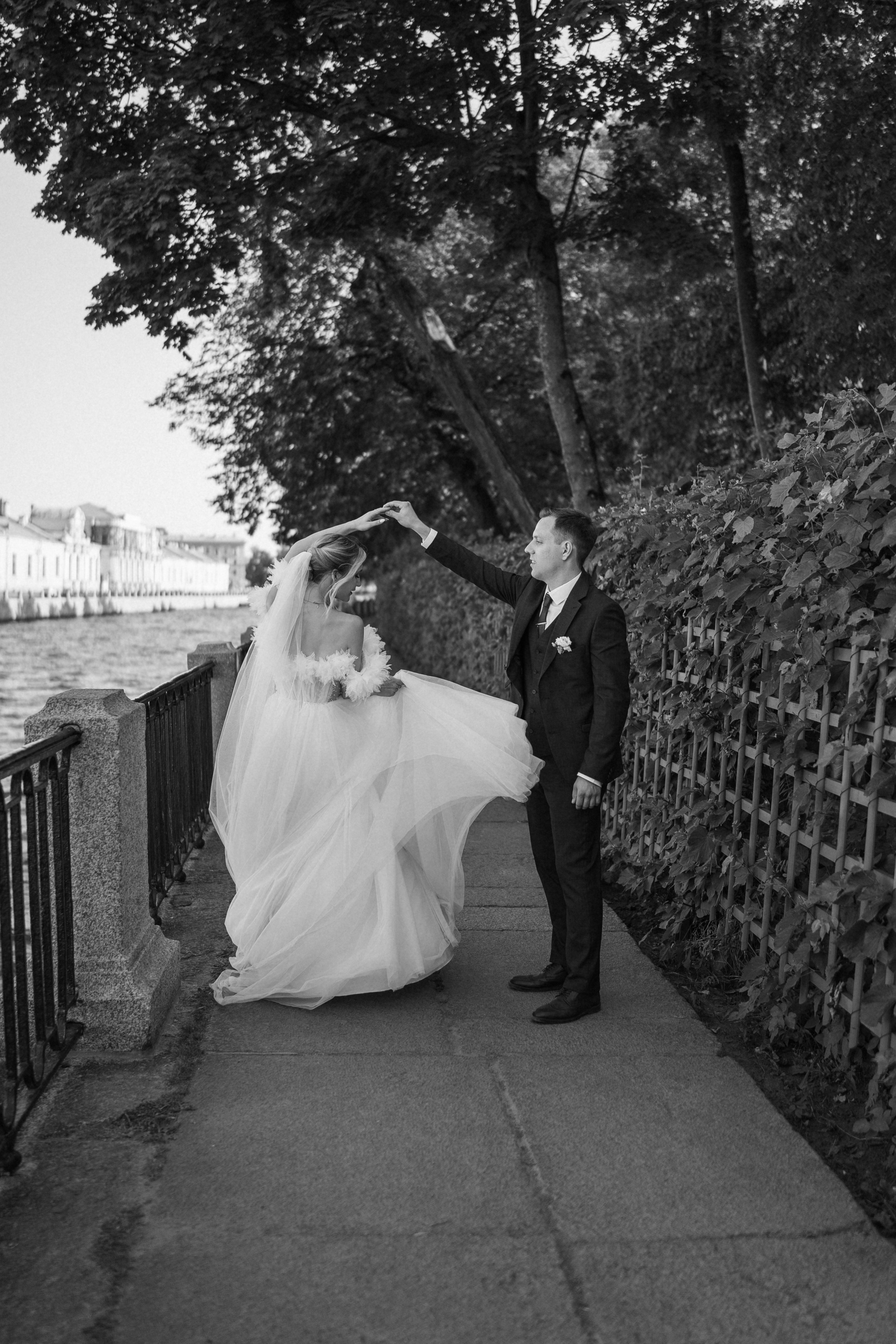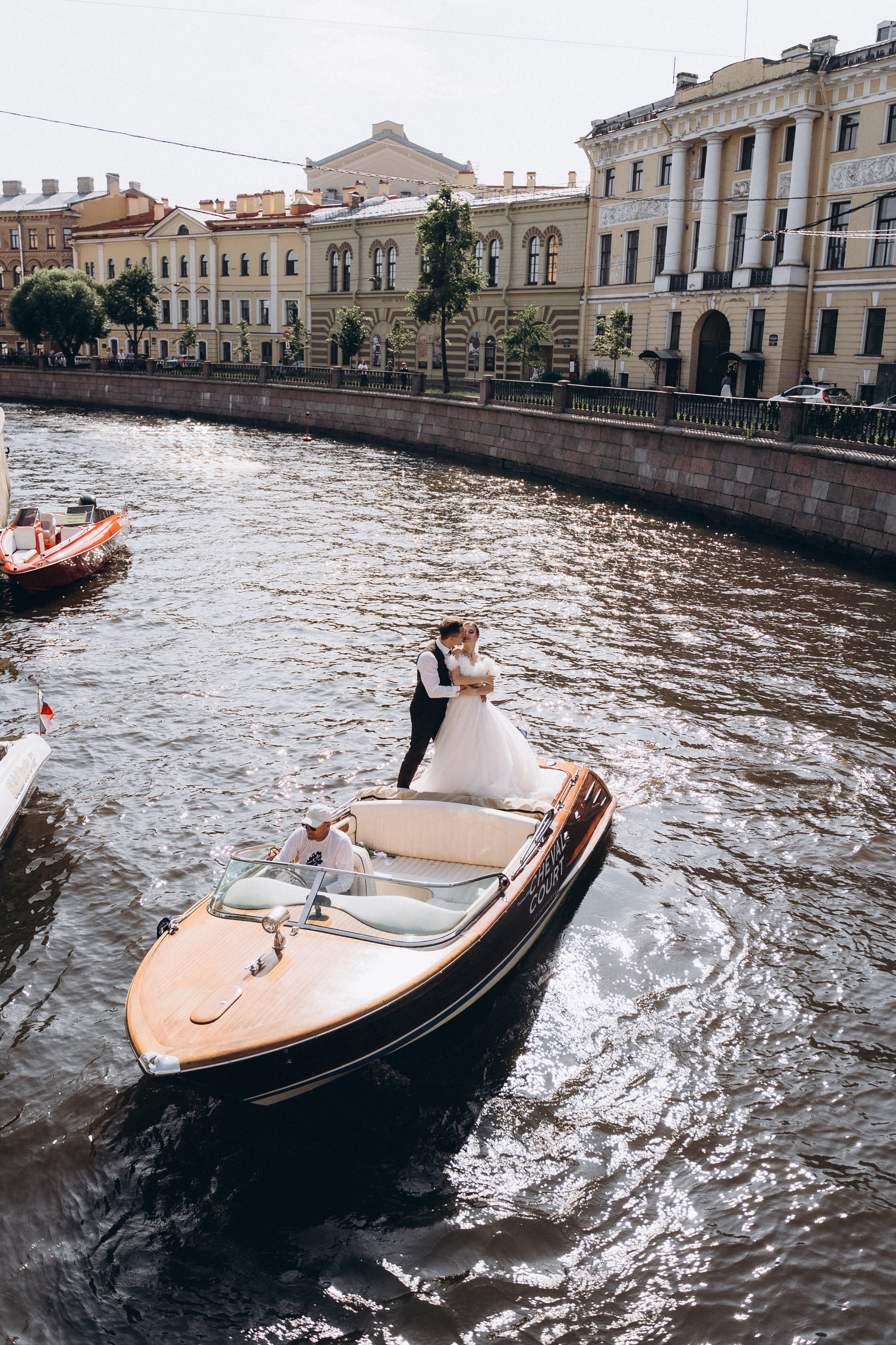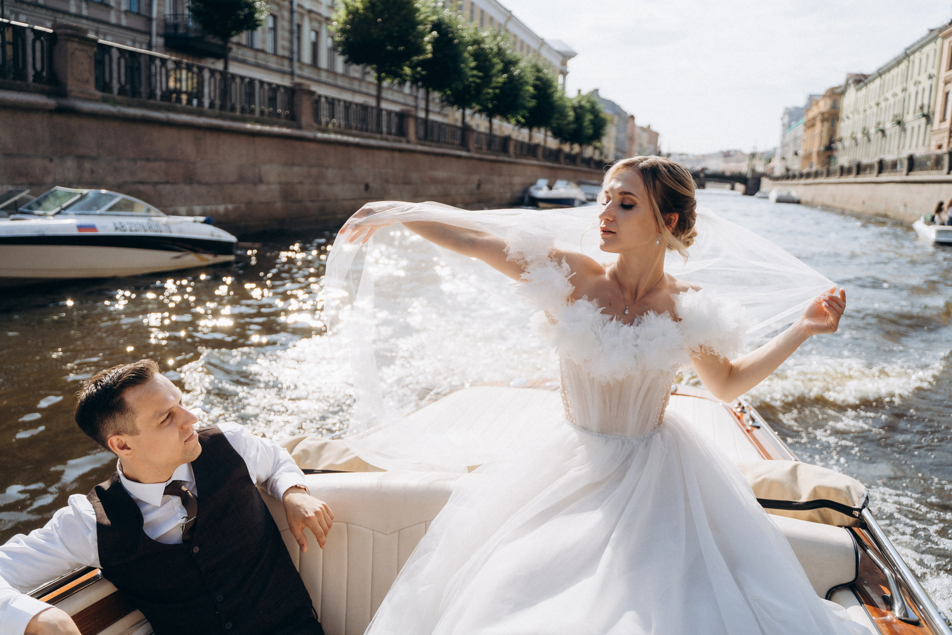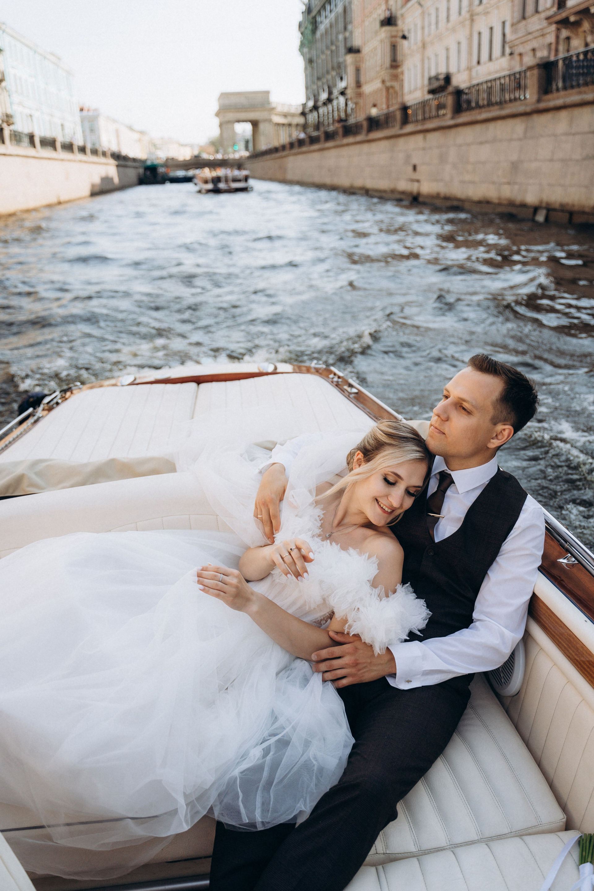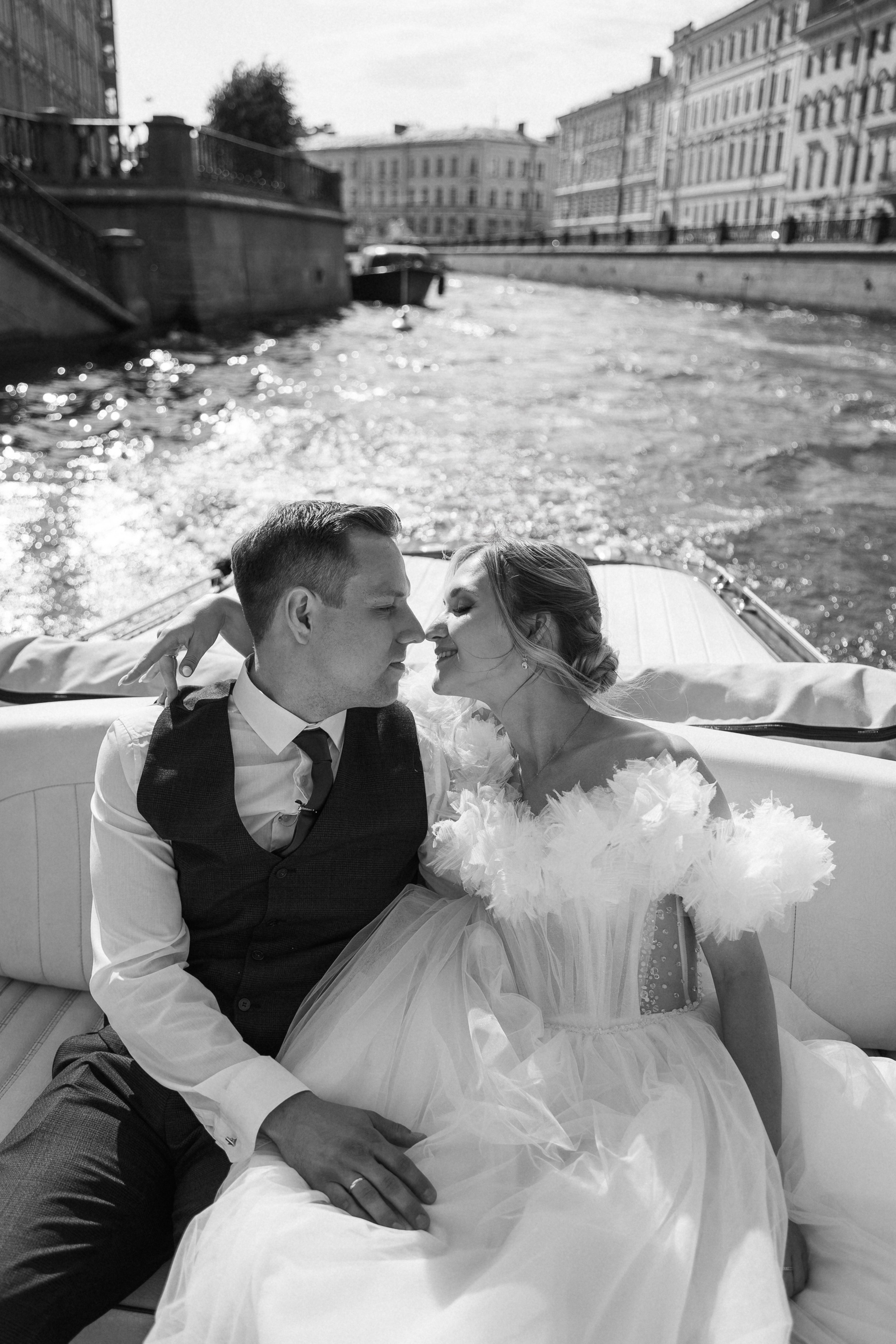 Всё самое важное: трогательные совместные сборы, волнительная первая встреча в свадебных нарядах, регистрация в ЗАГСе Петроградского района, прогулка по Летнему саду, Академии Штиглица и главное прогулка на катере с видами на Петербург